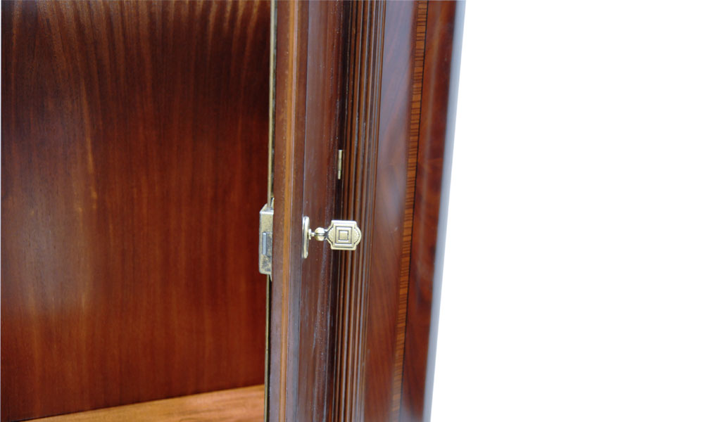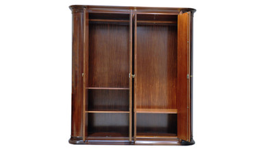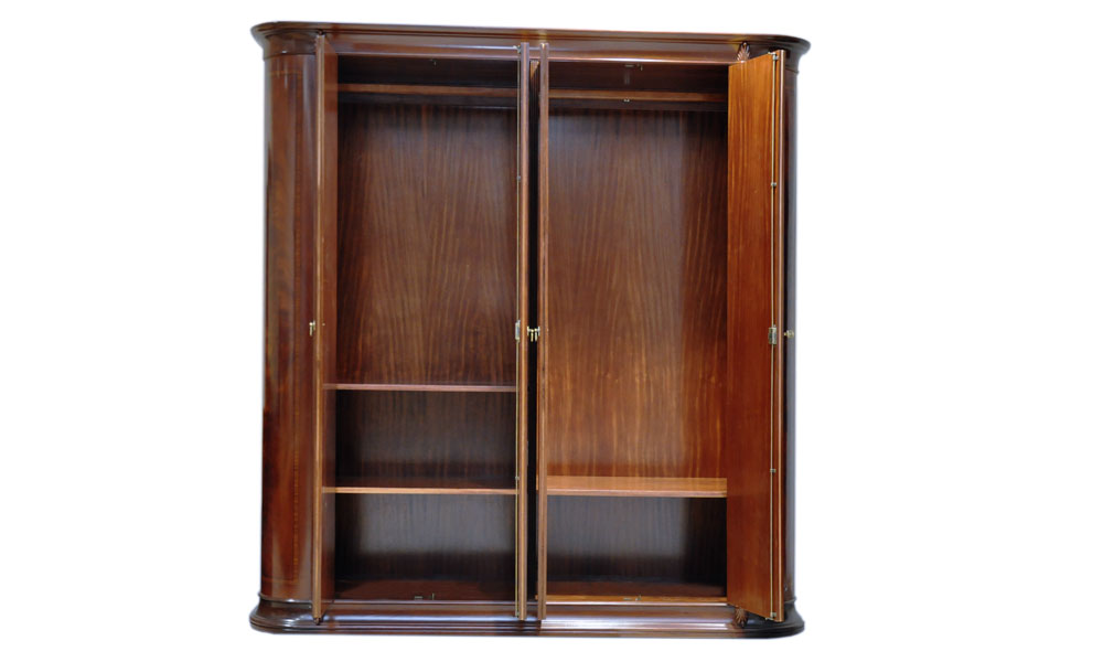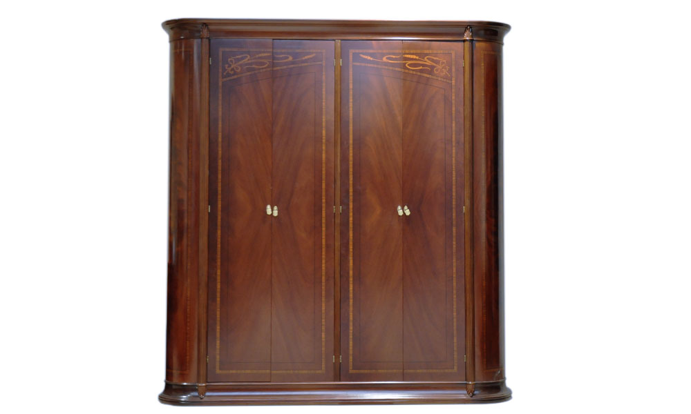 Если Вы хотите подчеркнуть богатую обстановку спальни, то замечательный 4-дверный шкаф PMS.1SA Вам прекрасно подойдет. Он имеет четкие и строгие формы дополняются массивными колоннами, располагающимися по бокам во всю высоту шкафа. Шкаф имеет четыре вместительных отделения, что позволяет максимально удобно располагать в нем вещи. Конструкция дверец шкафа предусматривает наличие пылезащитной планки. Удобство в использовании дополняют закрывающиеся на замки дверцы. Шкаф имеет восхитительный цвет, который подчеркивает атмосферу богатства и роскоши. Такой насыщенный цвет создаёт сочетание нескольких пород благородной древесины (тонированный ясень, олива, груша, лимонное дерево), которое и задает сложный симметричный рисунок поверхности. Несущие элементы каркаса изготовлены из массива американской липы, а поверхность великолепно инкрустирована шпоном различных пород дерева. Учитывая габаритные размеры и вместительность шкафа, следует заметить, что он будет отлично смотреться в просторном помещении.