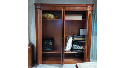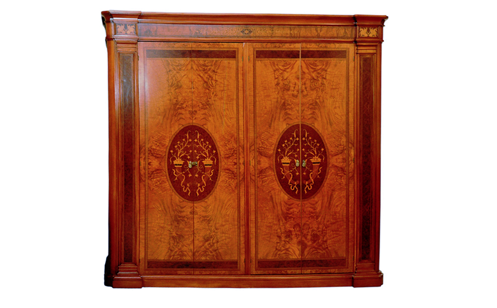 Если Вы хотите подчеркнуть богатую обстановку спальни, то замечательный 4-дверный шкаф VS-1-SA Вам прекрасно подойдет. Он имеет четкие и строгие формы дополняются массивными колоннами, располагающимися по бокам во всю высоту шкафа. Шкаф имеет четыре вместительных отделения, что позволяет максимально удобно располагать в нем вещи. Конструкция дверец шкафа предусматривает наличие пылезащитной планки. Удобство в использовании дополняют закрывающиеся на замки дверцы. Шкаф имеет восхитительный цвет, который подчеркивает атмосферу богатства и роскоши. Такой насыщенный цвет создаёт сочетание нескольких пород благородной древесины (тонированный ясень, олива, груша, лимонное дерево), которое и задает сложный симметричный рисунок поверхности. Несущие элементы каркаса изготовлены из массива американской липы, а поверхность великолепно инкрустирована шпоном различных пород дерева. Учитывая габаритные размеры и вместительность шкафа, следует заметить, что он будет отлично смотреться в просторном помещении.