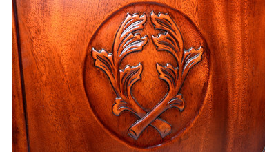 Необычное дизайнерское решение в декоре деревянных элементов из традиционного оттенка массива махагона - отделка резьбы в цвет серебряной или золотой глазури.