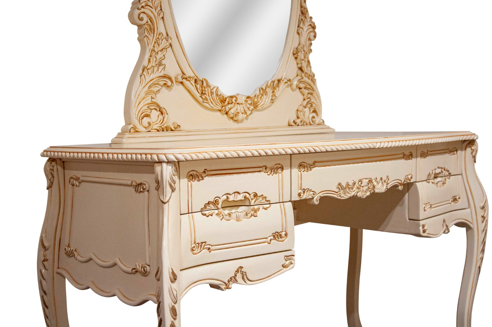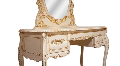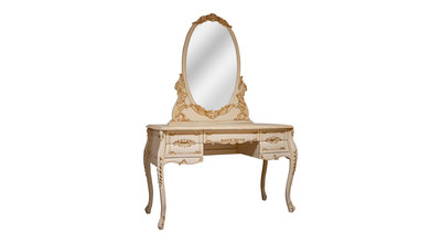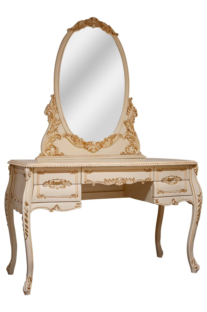 Применение массива красного дерева не вызывает сомнений как в надежности и долговечности конструкции мебели, так и в ее экологичности и безопасности. Махагон -твердая, мелковолокнистая и в тоже время очень пластичная древесина, что позволяет делать резные детали с очень искусной мелкой резьбой без расслоения и трещин. Махагон -древесина с лоском и красивым фактурным рисунком. Перед использованием в производстве мебели древесина проходит через полный цикл сушки и предварительной обработки антисептиками (для защиты от вредителей) и антипиренами (для устойчивости к воспламенению). Невозможно представить себе элитную спальню без роскошного туалетного столика. Туалетный столик BV 02-09 обладает элегантной формой и украшен изысканной невычурной резьбой, что придает ему по-настоящему аристократичный вид. Высокие точеные ножки позволяют с наибольшим комфортом расположиться за этим изысканно-красивым туалетным столиком. Столик имеет пять выдвижных ящиков, в которых можно удобно расположить необходимые вещи. Кроме того, оптимального размера столешница позволяет разместить предметы декора и другие вещи на столике. Великолепный туалетный столик BV 02-09 станет прекрасным компонентом любого великосветского интерьера.