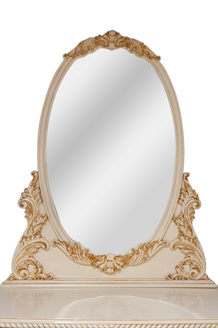Важным дополнением к любому туалетному столику является зеркало. К столику BV 02-09 лучше всего подойдет зеркало BVM 02-09. Оно выполнено в той же стилистике, что и столик. Зеркало имеет правильную овальную форму, а рама усложнена бесподобной резьбой и красивым нетривиальным основанием.