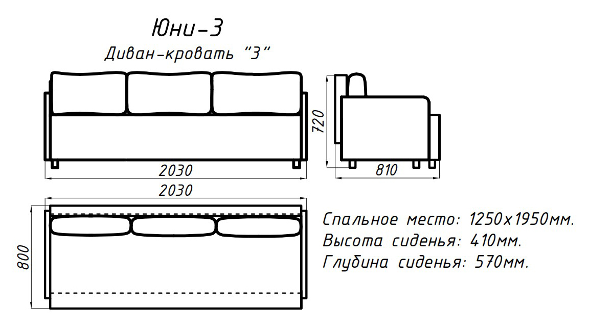 «Юни» трехместный диван-кровать с тонкими подлокотниками