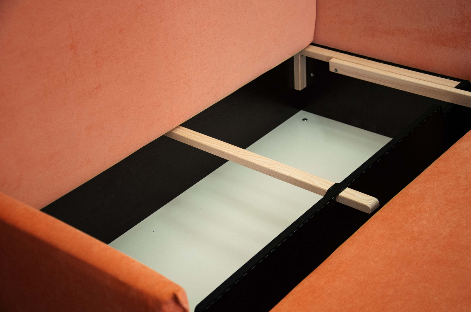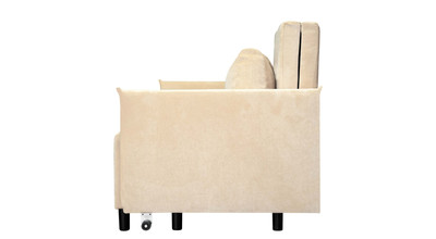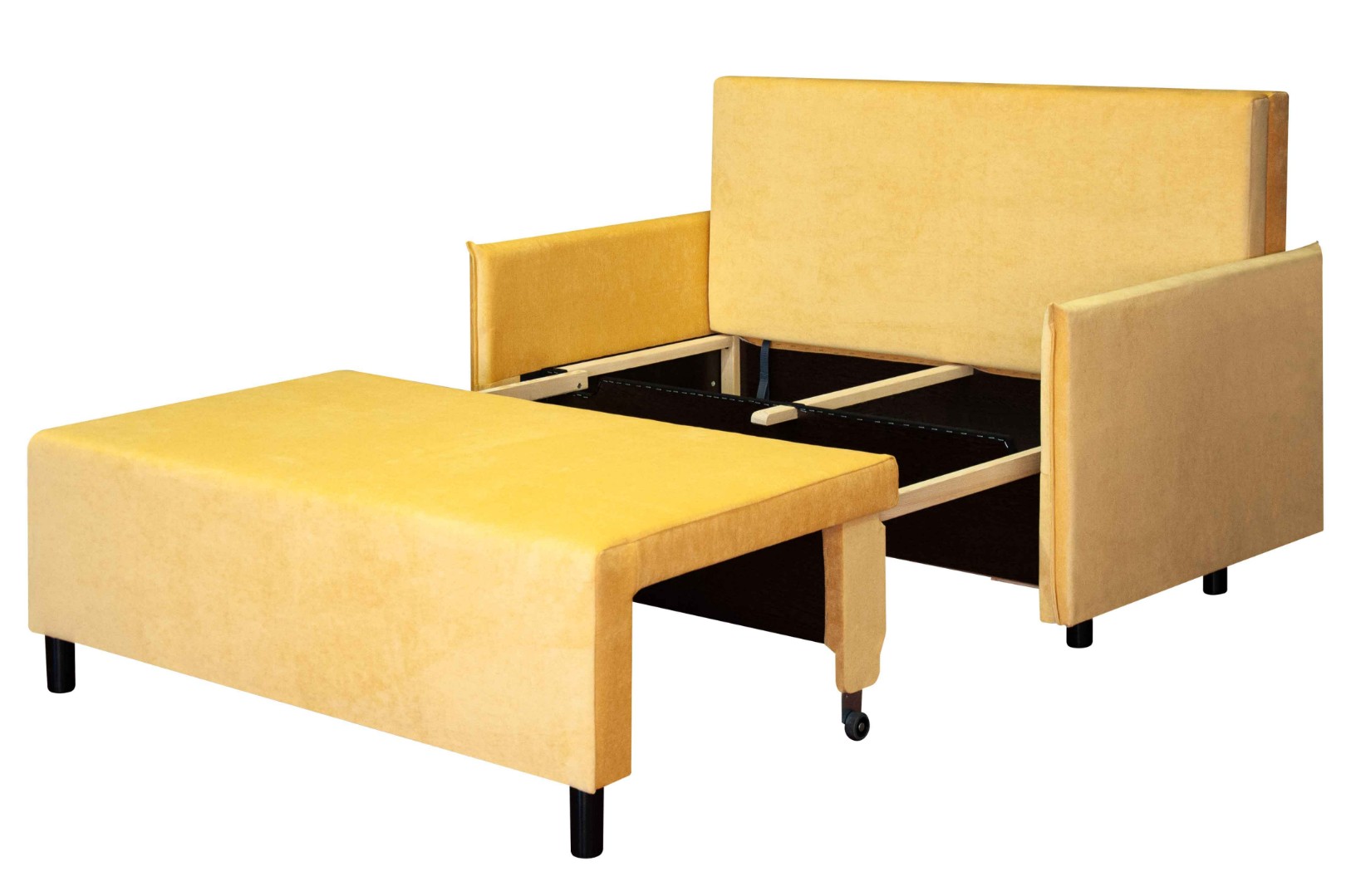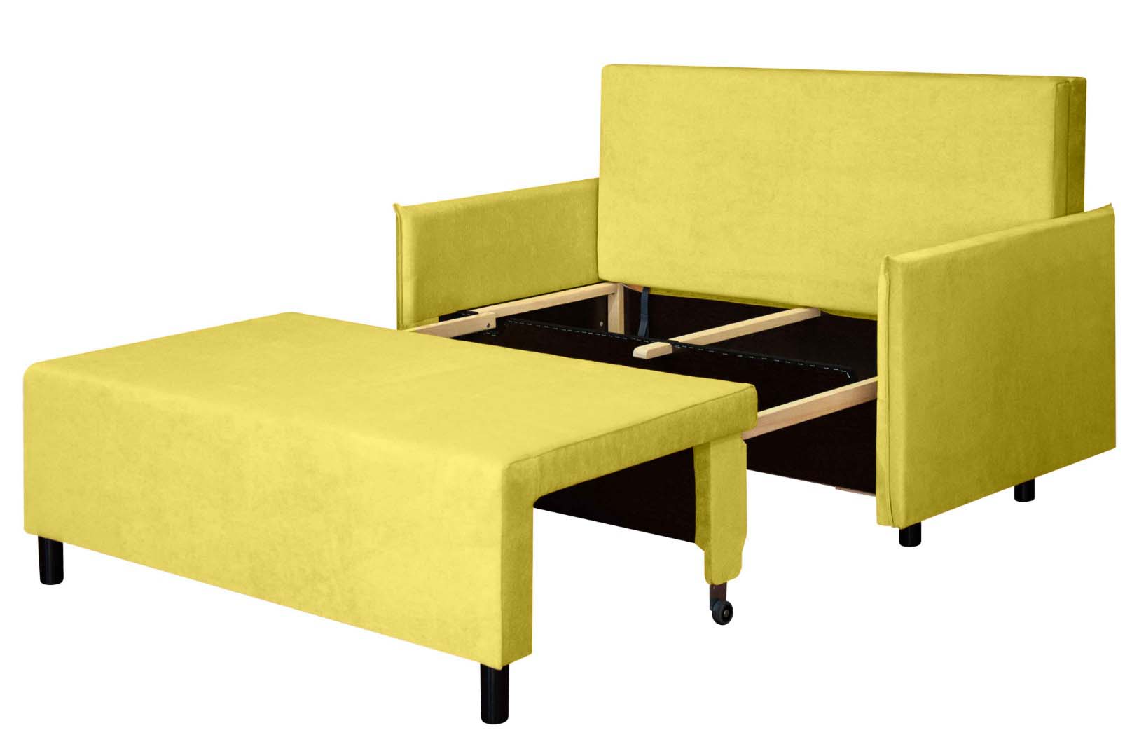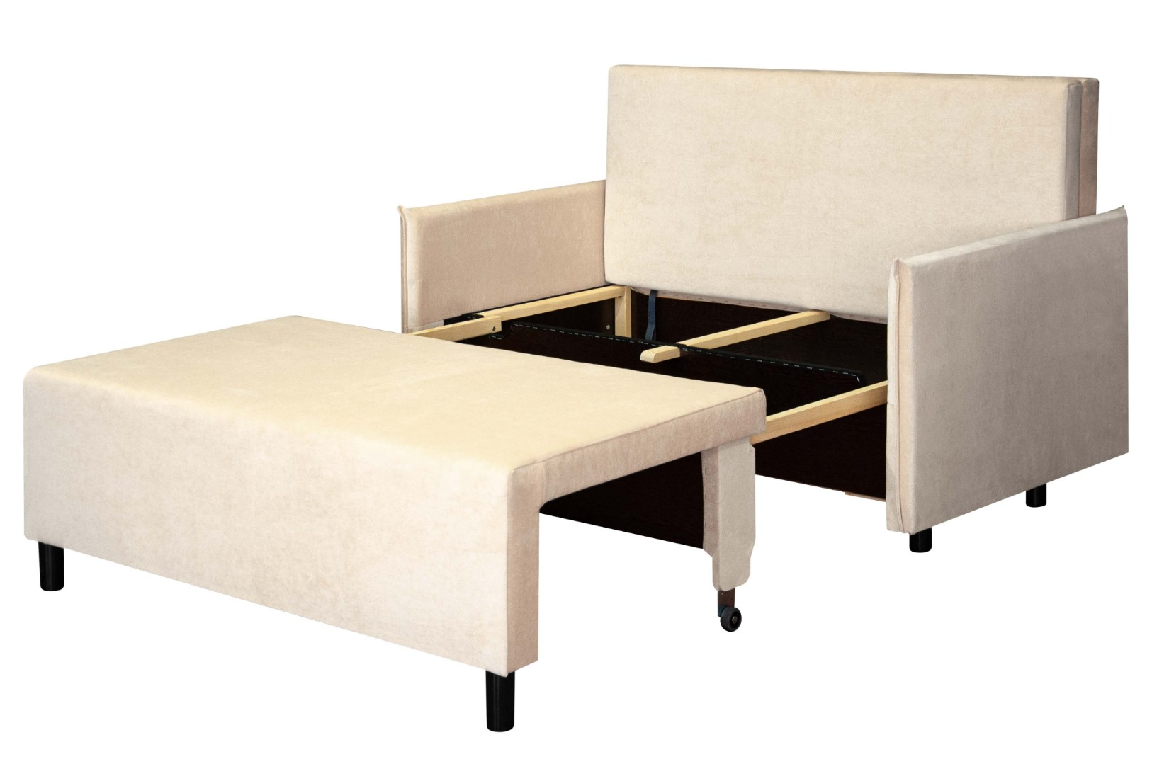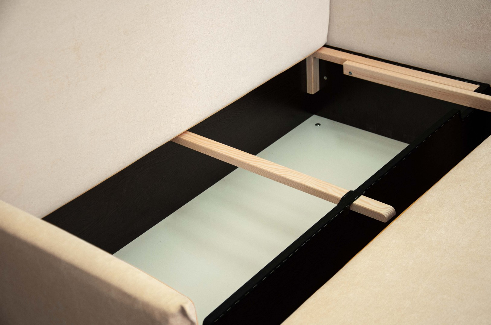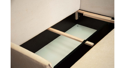 Механизм трансформации обеспечит легкость и безопасность складывания и раскладывания, а поскольку каркас изготовлен исключительно из сухой древесины, ДСП и фанеры, диван весьма удобен в передвижении по комнате, т. к. механизм имеет небольшой вес. Также конструкция механизма позволяет разместить внутри дивана объемный ящик для белья.