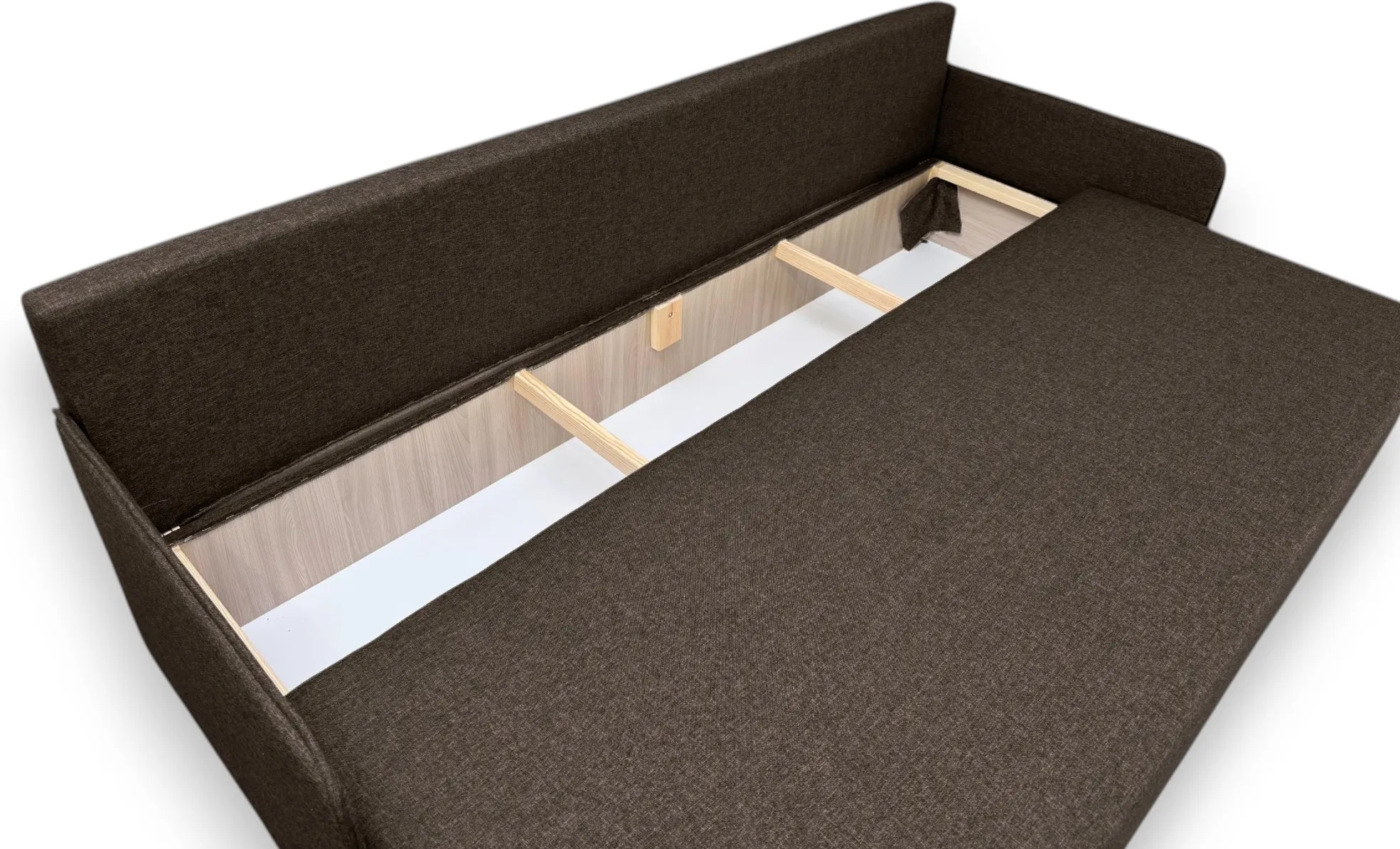 Прочность каркаса обеспечивает использование сухого бруса хвойных пород и ДСП. Имеет вместительный ящик для хранения постельных принадлежностей.
