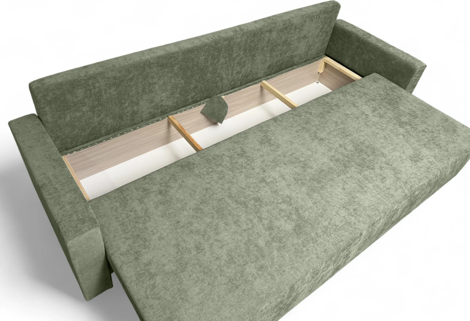 Площадь дивана полностью используется под спальное место. Спальное место — умеренно жесткое. Наполнение — высокоэластичный пенополиуретан.