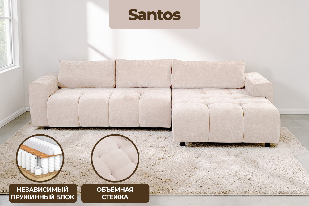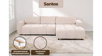 • «Santos» - большой угловой диван-кровать, который станет центром притяжения для всей семьи  и прекрасным  местом для комфортного  отдыха большой компании друзей .  Это отличное сочетание стиля, комфорта и практичности.