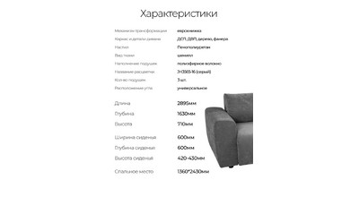 При изготовлении каркаса дивана используется только сухая древесина хвойных пород в сочетании с ДСП и фанерой , что позволяет исключить деформацию элементов дивана с течением времени и продлевает срок службы дивана. Особый комфорт сиденью придает использование в основании настила из высокоэластичного пенополиуретана и синтепона в качестве прослойки между тканью и ППУ.