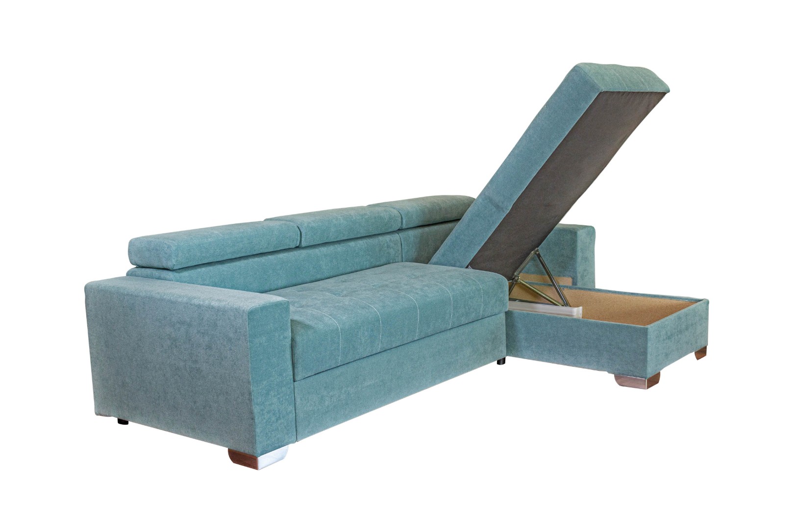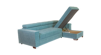 Вместительный ящик для постельных принадлежностей расположен под угловой частью дивана, а доступ к нему осуществляется через подъемный механизм. Модель с ППУ славится более объемным ящиком, что позволяет эффективно организовать хранение белья.
