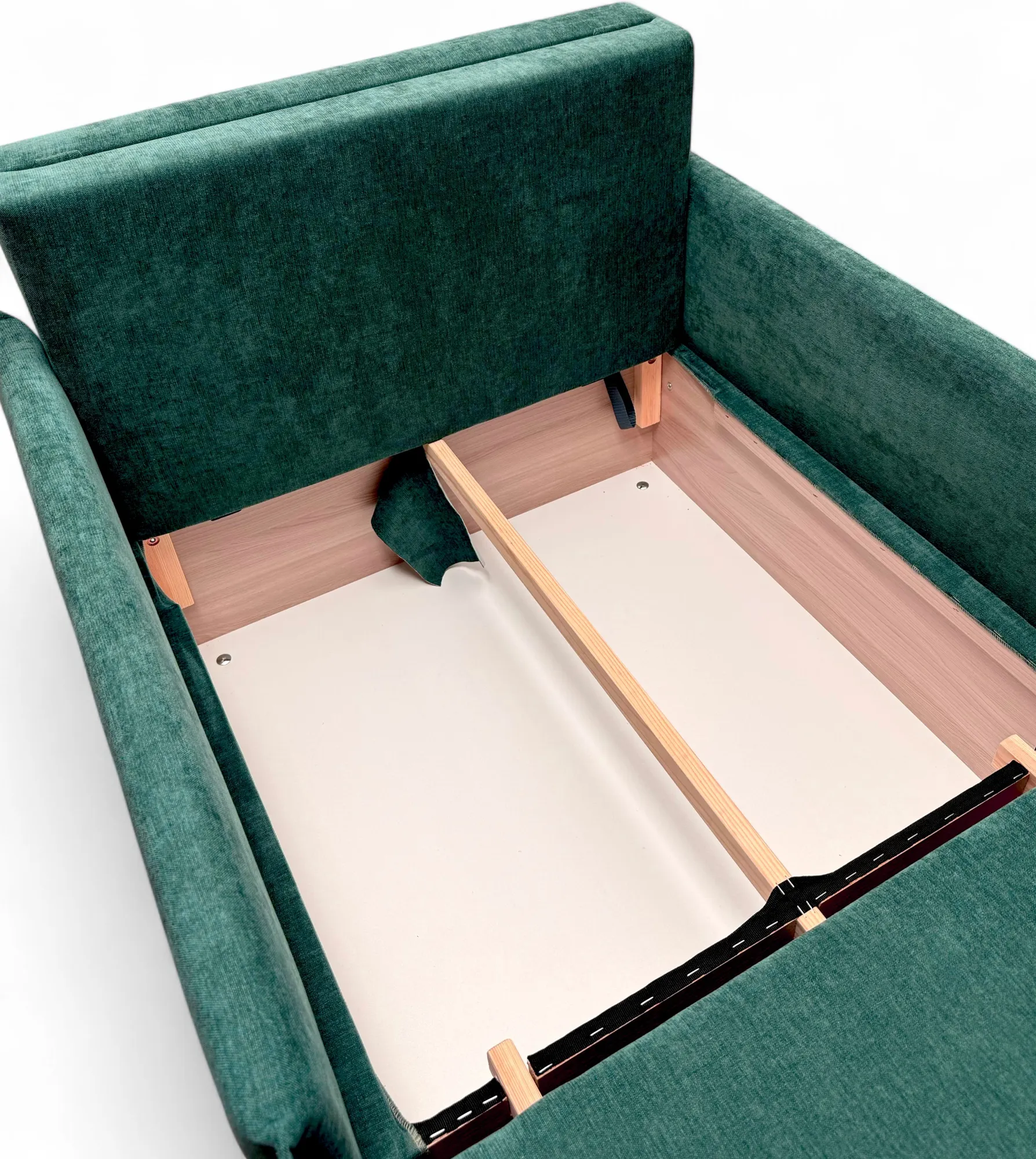 Механизм трансформации обеспечит легкость и безопасность складывания и раскладывания, а поскольку каркас изготовлен исключительно из сухой древесины, ДСП и фанеры, кресло весьма удобно в передвижении по комнате, т. к. механизм имеет небольшой вес. Также конструкция механизма позволяет разместить внутри кресла объемный ящик для белья.