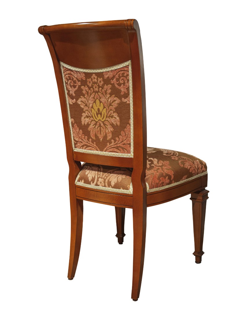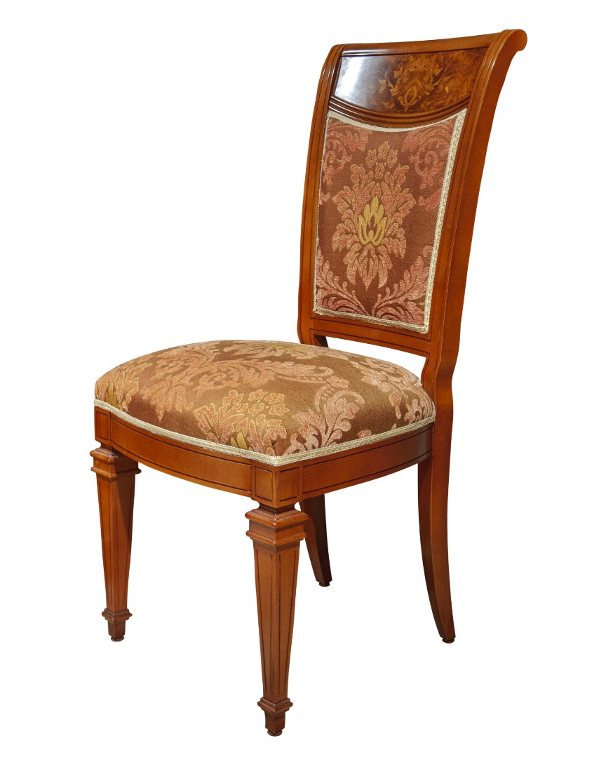 Несущие элементы изготовлены из массива американской липы, а в отделке сочетается шпон различных пород (тонированный ясень, олива, груша, лимонное дерево). Четкие очертания и декор, присущие древнеримским зданиям, придают этой модели массивный, презентабельный внешний вид. Этот стул имеет классические строгие основательные формы. Особого внимания заслуживает насыщенный янтарный цвет. Он настолько богат, что не поддаётся чёткому определению, ведь его создаёт сочетание нескольких пород благородной древесины. Ощущение от этого необычно переливающегося цвета подарит Вам отличное настроение, снимет стресс и создаст иллюзию праздника! Декор, образованный шпоном, геометрически выверен и создает ритмичный рисунок.