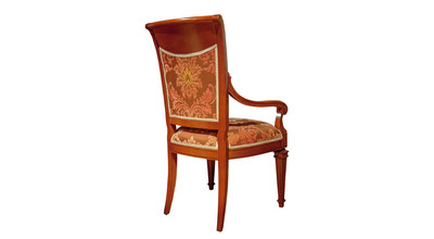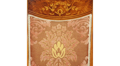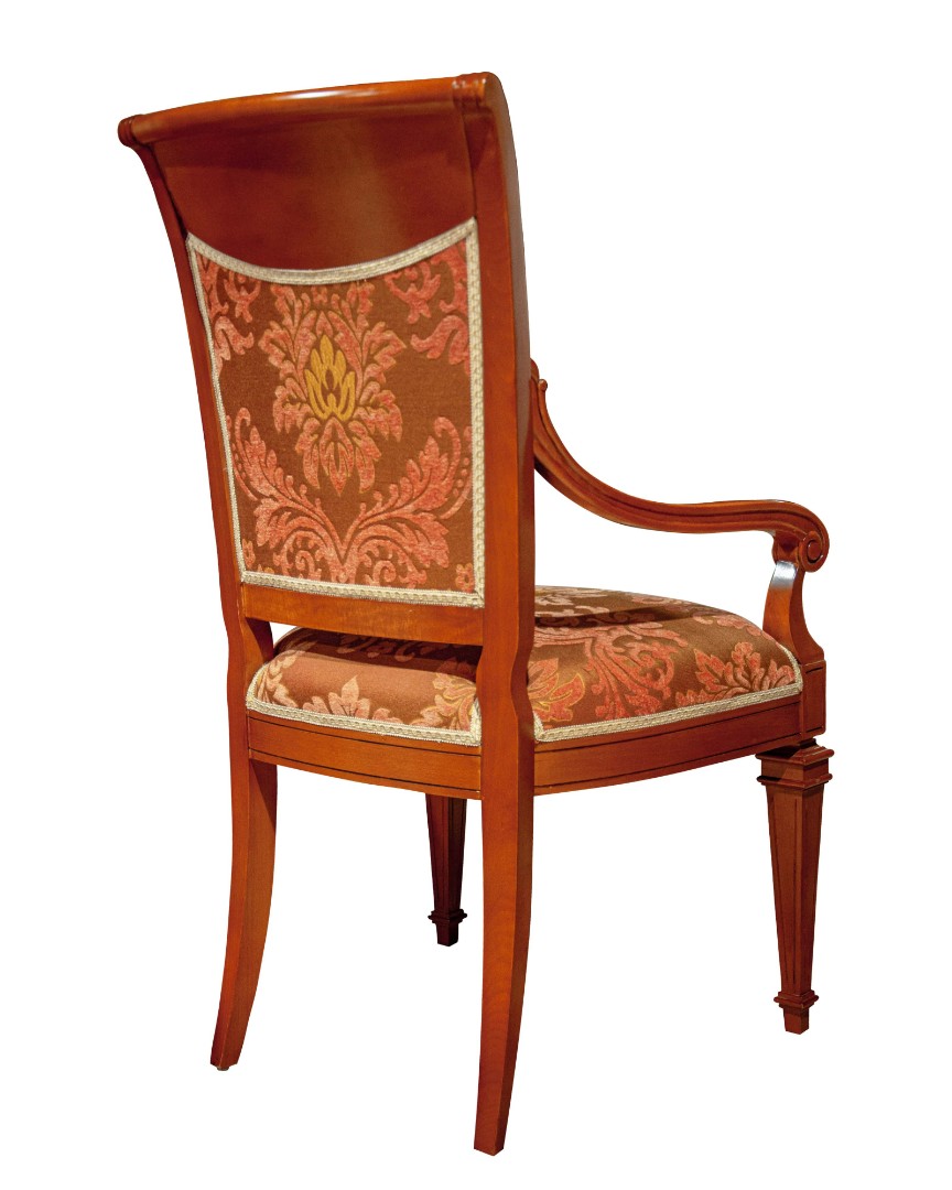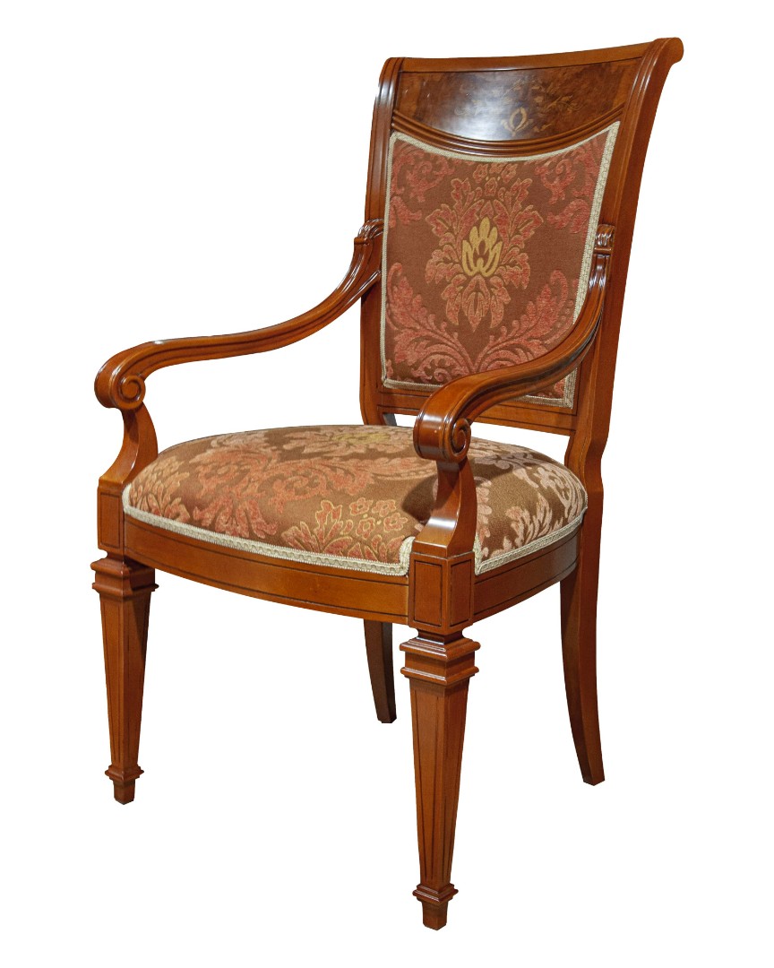 Несущие элементы изготовлены из массива американской липы, а в отделке сочетается шпон различных пород (тонированный ясень, олива, груша, лимонное дерево). Четкие очертания и декор, присущие древнеримским зданиям, придают этой модели массивный, презентабельный внешний вид. Этот стул имеет классические строгие основательные формы. Особого внимания заслуживает насыщенный янтарный цвет. Он настолько богат, что не поддаётся чёткому определению, ведь его создаёт сочетание нескольких пород благородной древесины. Ощущение от этого необычно переливающегося цвета подарит Вам отличное настроение, снимет стресс и создаст иллюзию праздника! Декор, образованный шпоном, геометрически выверен и создает ритмичный рисунок.